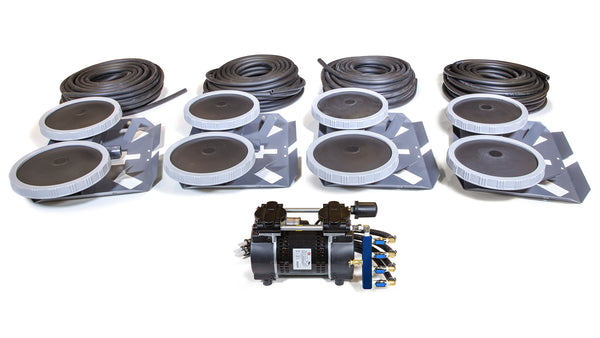 The Bubble Pro Max XL comes complete with four diffusers; four lengths of 100-foot by 3/8-inch quick-sink weighted tubing; a ¾-hp, rocking-piston compressor; a valved air outlet assembly with individual controls for each hose and a pressure relief valve; and all required fittings and clamps.