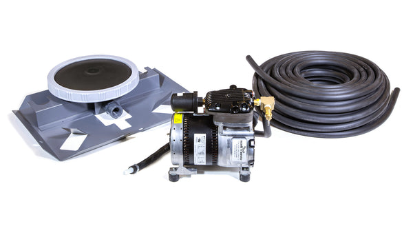 The Bubble Pro Mini comes complete with one diffuser; one length of 100-foot by 3/8-inch quick-sink weighted tubing; a ¼-hp, rocking-piston compressor; a valved air outlet assembly with individual controls for each hose and a pressure relief valve; and all required fittings and clamps.